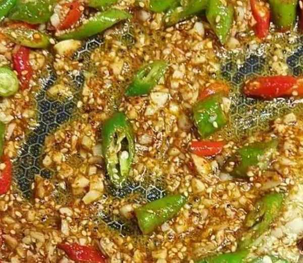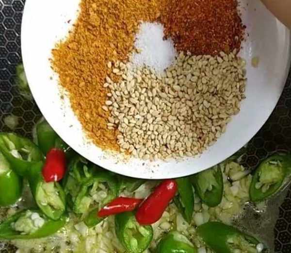 再往裡面加入燒烤辣椒面、孜然粉、熟白芝麻、鹽。
