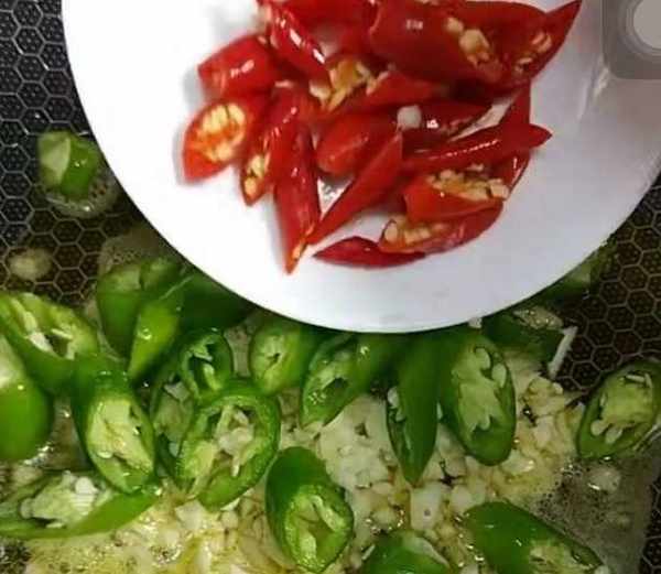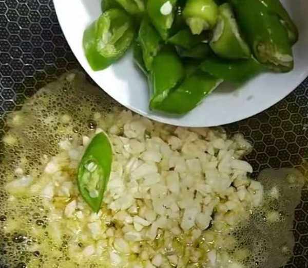 青辣椒提前切好,然後下入鍋中炒。