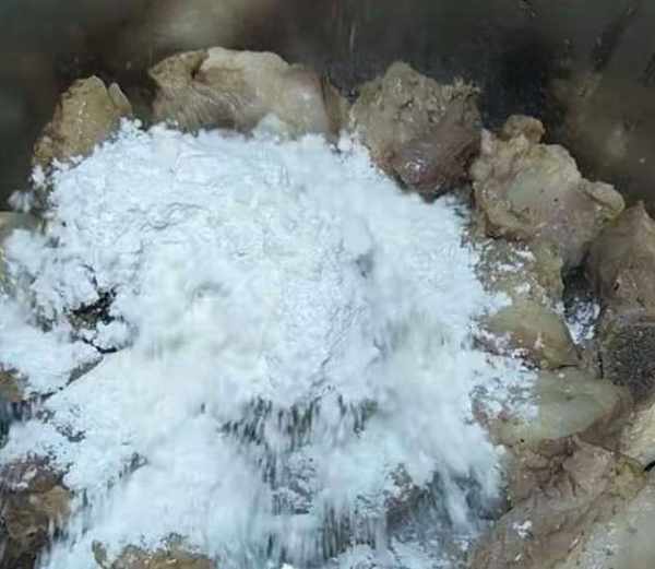 把排骨放到大盆裡,加入淀粉,然後給拌均勻,讓淀粉都裹上排骨。