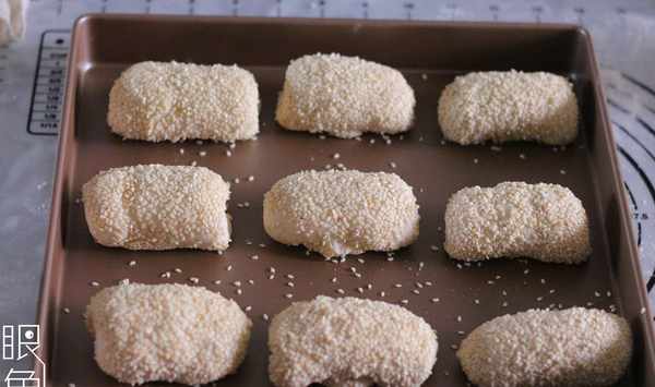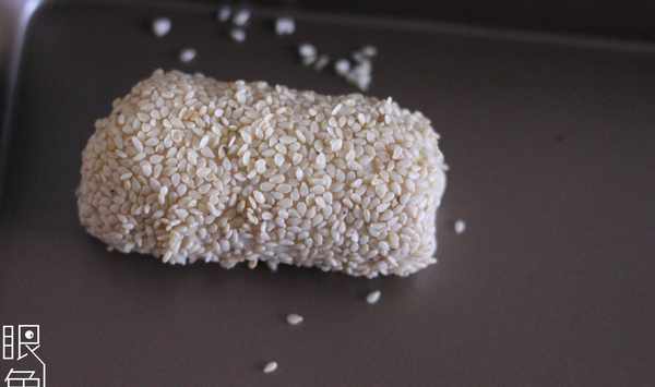 5.表面薄薄刷一層水,在白芝麻裡滾一下。讓面團全身都蘸滿芝麻,成品更香。