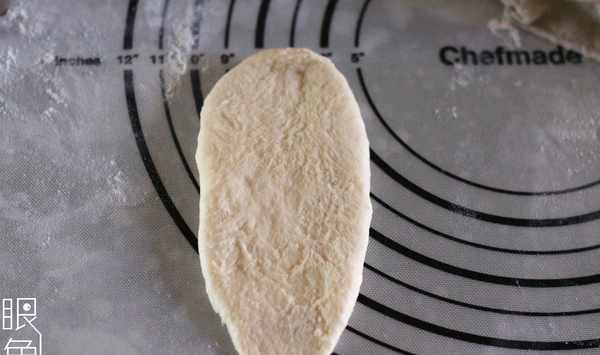 3.輕拍面團排氣,把面團搟成橢圓形,底部搟薄一些。底部搟薄一些可以讓接口更貼合。