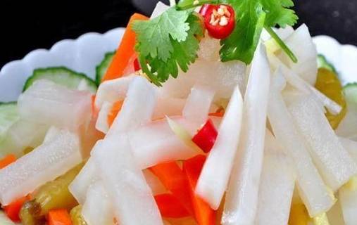 酸辣脆爽蘿卜:1、白蘿卜洗凈去皮切片,厚約0.3厘米。2、放鹽,醃制約30分鐘至蘿卜片變軟,有很少蘿卜水出來時,撈出瀝幹。3、瀝幹水的蘿卜片倒入陶瓷碗中,放入辣椒、白醋、白糖,白醋要蓋過蘿卜片。4、浸泡3個小時之後即可食用。具體浸泡時間取決蘿卜片的大小和數量。