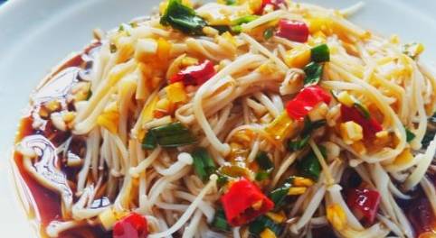 涼拌金針菇:1、水燒開,先放入金針菇、黃甜椒絲燙30秒,最後加入蔥絲拌勻,撈出。2、將撈出的1料放入冰水裡浸泡半分鐘。3、1.5勺生抽、1勺香醋、小半勺蜂蜜(糖)和蒜蓉充分拌勻成濕料,將2料撈出,輕輕擠幹水分放入拌勻。4、上桌前滴幾滴香油即可。