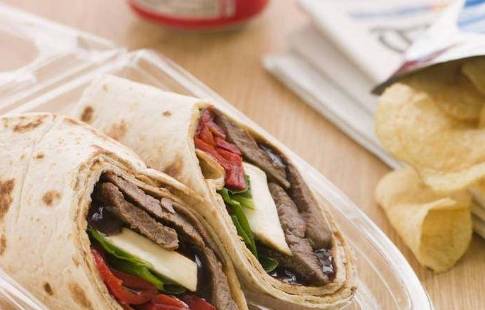 2,取一張餅皮擦上適量甜面醬,放上蔥段、生菜,紅甜椒和牛肉薄片卷起即可。