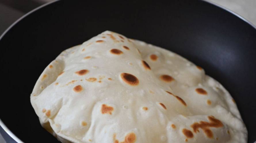 1,取一平底鍋,中火燒熱放入捍好的餅皮烙一下,翻面烙至中間鼓起,從中間撕成兩張.