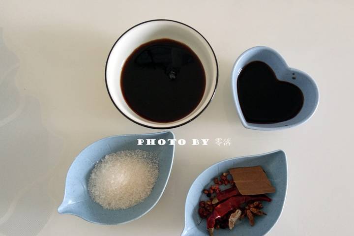 2、備好調料:生抽、醋、細砂糖、幹辣椒、花椒、八角、香葉;