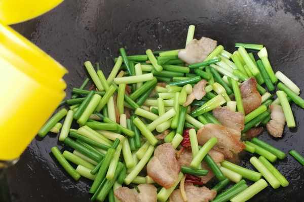 4、大火翻炒兩分鐘後放入鹽和一小勺生抽,炒均勻即可出鍋。蒜臺最好不要在鍋裡停留時間太長,以免破壞蒜臺脆嫩的口感。