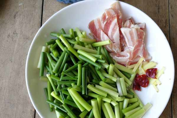 準備食材:蒜臺一把,五花肉一塊,生薑兩片,幹紅辣椒一根,鹽適量,生抽一小勺,花生油適量