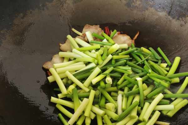 3、炒到五花肉油脂煸出,變成焦黃色後,放入生薑和幹紅辣椒,炒出香味,再放入蒜臺大火翻炒。