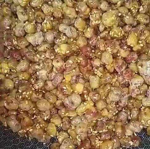 8、然後倒入炸好的花生米,再撒點熟的白芝麻,會顛鍋的記得來幾下吧,將糖汁鎖住花生米即可。