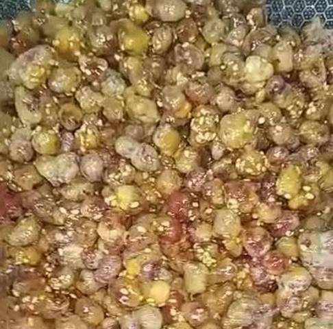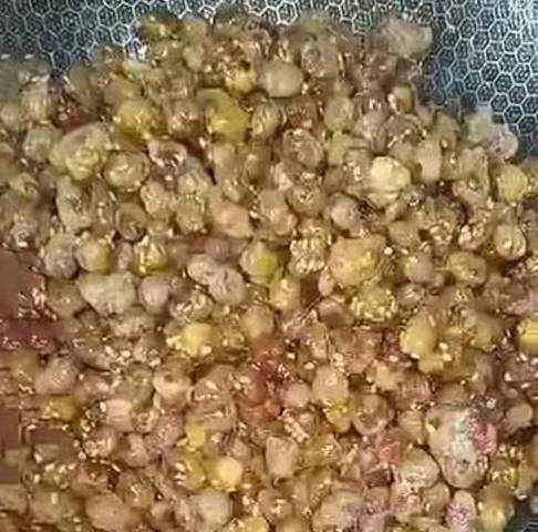 6、炸熟後將花生米撈出放涼,瀝幹油分,用吸油紙或者用漏勺正對著炒鍋顛幾下,把它徹底甩幹,此法最實用。