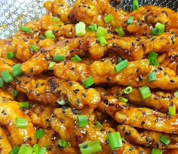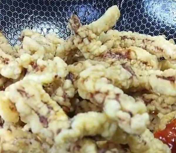 再把炸好的肉條下入鍋中,給翻炒均勻。