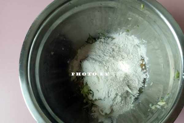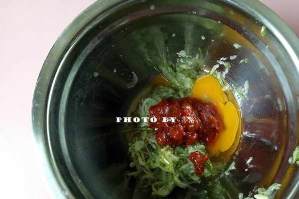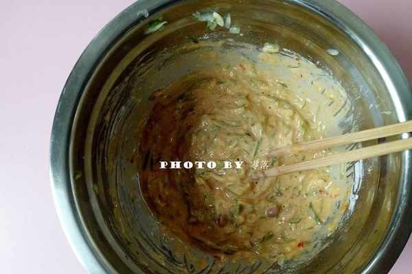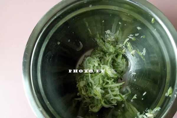 2、黃瓜洗凈後,刨絲;用適量鹽攪拌均勻;黃瓜醃制出水後,擠幹水分;
