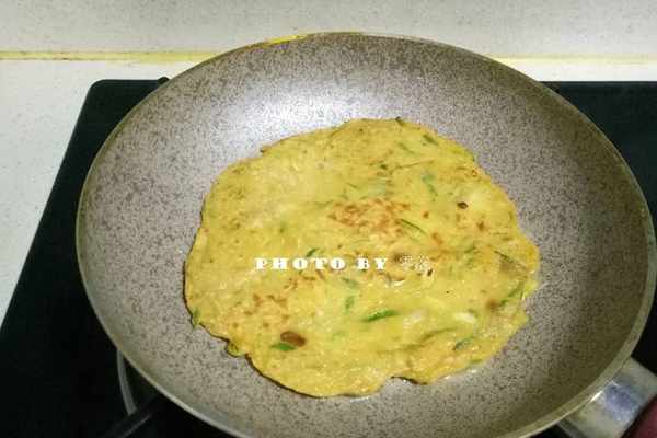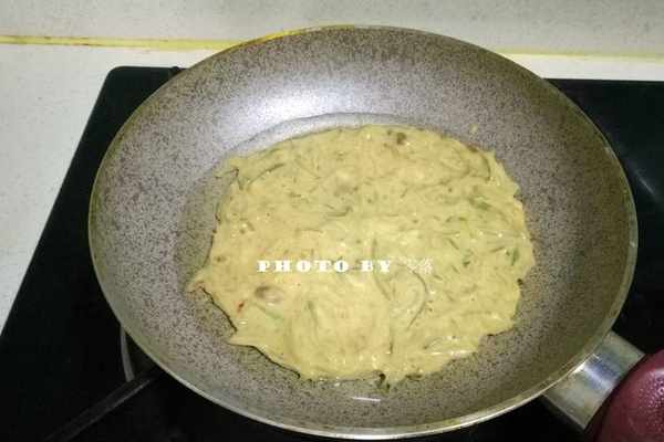 6、不粘鍋燒熱,倒入少許植物油;用勺子將面糊舀到鍋裡,盡量攤成圓餅狀;