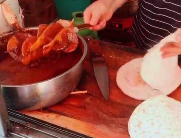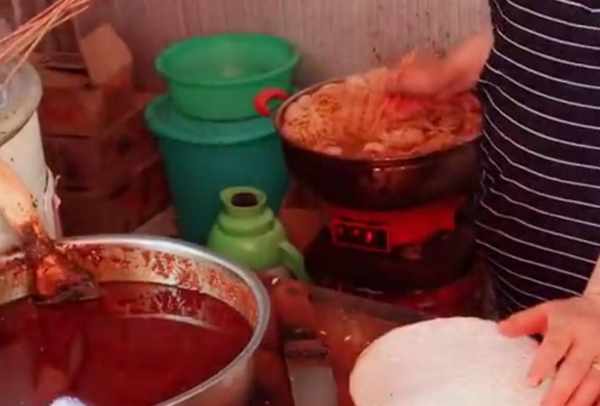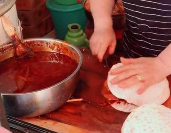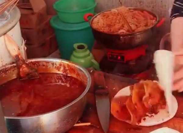 土豆切成薄片煮熟之後備用,如果有人購買的話,就會拿出之前串好的土豆片,蘸上秘制的醬料,夾在餅裡。旁邊的鍋裡還有很多配菜,可以選擇。味道香辣,一個就可以吃的飽飽的。因為價格便宜,味道又超級好,所以吸引瞭很多的顧客。