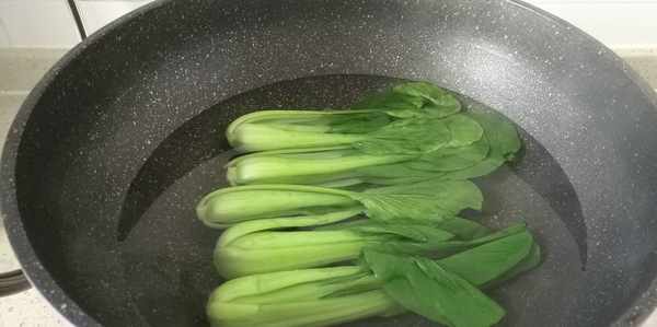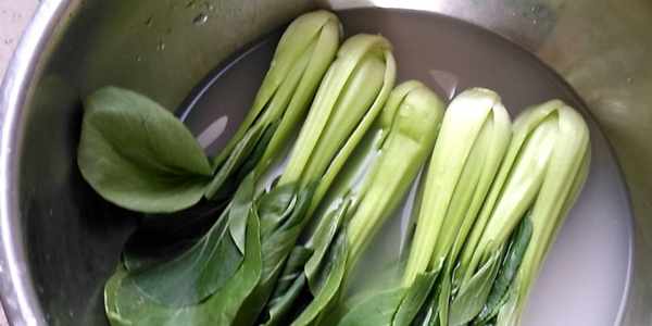 3.用淘米水浸泡油菜10分鐘,洗凈。