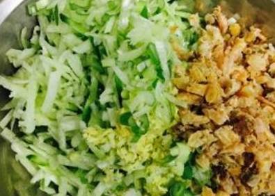 自己種的白蘿卜,青皮的,很好吃,洗洗幹凈,不需要削皮、擦絲即可,然後用刀剁碎,因為我很喜歡吃海米,姥姥就在蘿卜絲裡面加瞭很多泡好的海米。姥姥說他們那時候吃的隻有蘿卜,就這樣,她們都覺得很滿足瞭!做這個餡料的時候,不要把菜汁擠出來,包這個菜團子一定需要菜汁!姥姥還說,下廚做飯不僅僅是為瞭吃飯,更為瞭享受創作藝術品的樂趣,享受生活,品味生活,把廚房裡的每一件廚具、調味品都看成是一件藝術品,那麼我們的生活才會更有滋味,我們的生活各個角落將充滿藝術元素。
