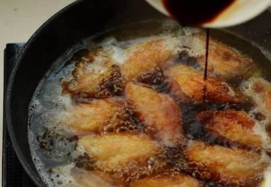 蓋上鍋蓋,大火燒開後轉中火燉15分鐘,然後轉大火收汁。至雞翅表面裹上焦糖色,即可關火裝盤