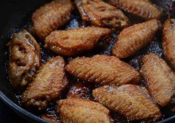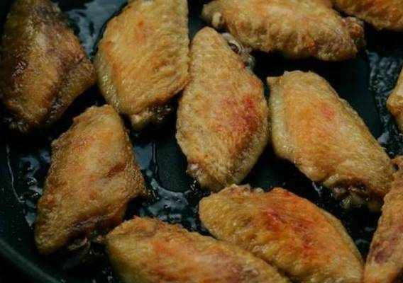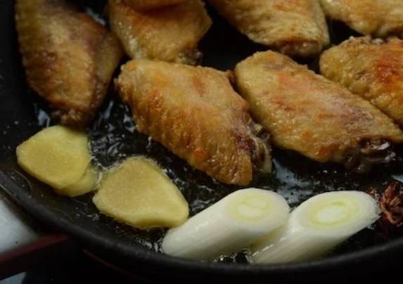 平底鍋放入少許油,油熱後,將雞翅放入其中,煸炒至兩面微黃