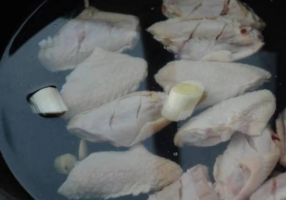 將雞翅洗幹凈,反面劃兩刀。鍋裡倒入清水,放入雞翅、2塊薑片和適量料酒。大火燒開後撇去浮沫,雞翅撈出備用