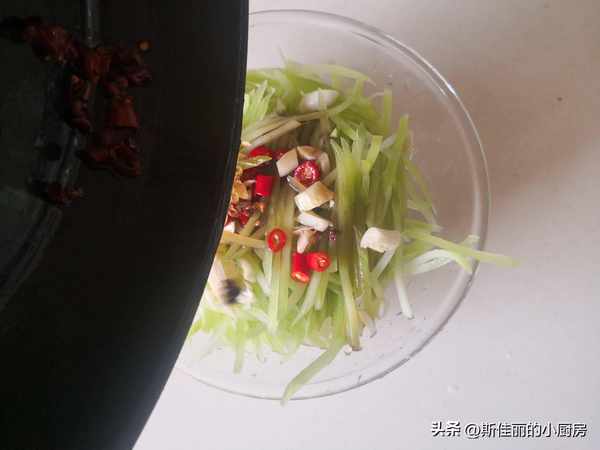 原料: 萵苣 蒜 紅椒 幹辣椒 花椒粒 生抽 醋 油 鹽