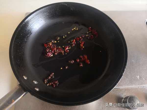 2 熱鍋涼油, 將幹辣椒和花椒粒進鍋煸炒香;