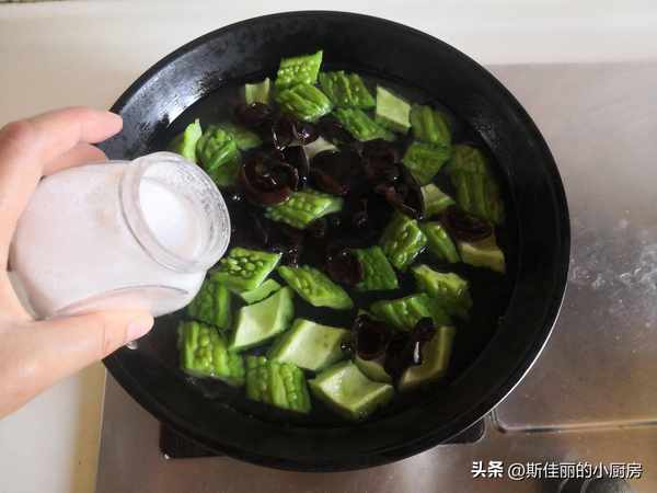 制作:1. 燒鍋水加入少許鹽和幾滴油,將準備好的苦瓜片和泡軟的黑木耳放進鍋中焯煮至八、九成熟後撈出備用;