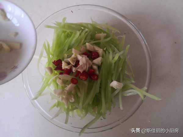 3 萵苣絲微微擠出汁後加入蒜末和紅椒圈;
