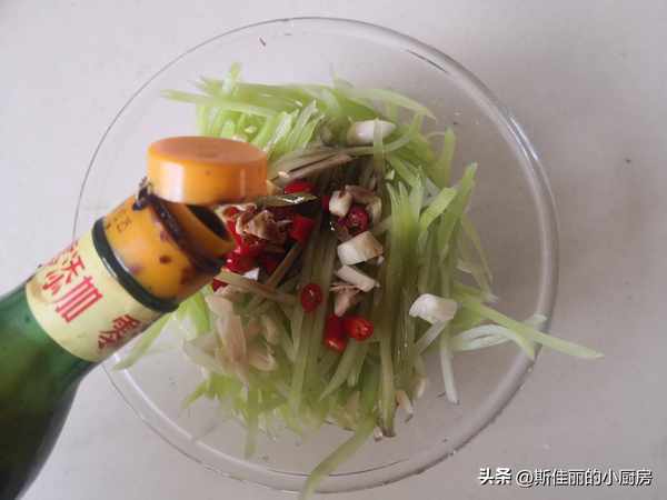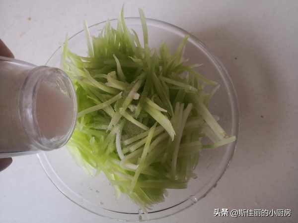 制作:1. 將萵苣去皮後切成絲加入少許鹽醃制一下;
