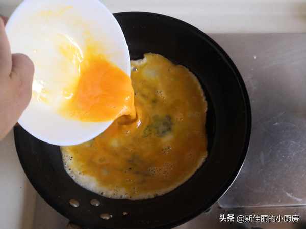 2. 熱鍋涼油, 倒入準備好的雞蛋液, 雞蛋煎至定型後劃散成小塊先盛出來備用;
