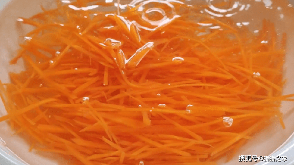 3.鍋中燒水,加入幾滴食用油,水燒開後把切好的胡蘿卜絲放進來焯水,焯水的時間不要太長,大約20秒左右就可以撈出來,接著過一下涼水,然後用漏勺撈出控幹水分。