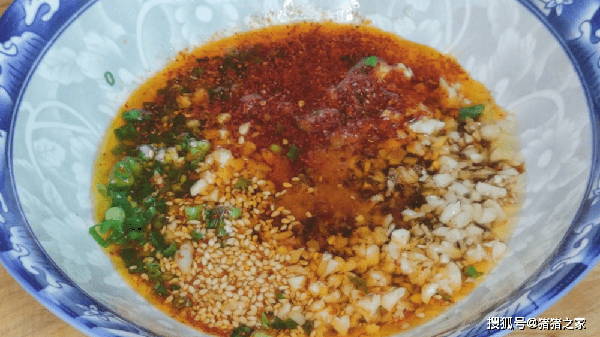 5.準備一個空碗,加入蒜末、蔥花、一勺辣椒粉、一勺白芝麻。接著鍋中加入少許的食用油,油熱後放入一小把花椒,開小火炸出花椒的香味。花椒炸香炸變色後用漏勺撈出來,然後再把油溫升高一點,把熱油潑在碗中,激發出香味。接著往裡面加入一勺生抽、一勺香醋、小半勺鹽、少許白糖、少許的香油,用勺子攪拌均勻。