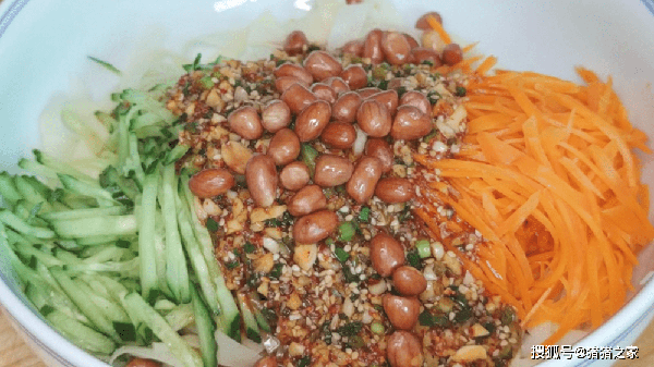 6.把胡蘿卜和黃瓜絲倒入面皮碗中,再把調好的料汁倒進來,傢裡條件好一點的可以加一些炸好的花生米,然後抓拌均勻。真是太香瞭,餃子皮像這樣做真的好吃到沒有朋友。