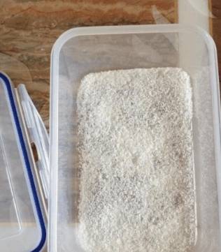 首先準備一個幹凈的方盒,無水無油。底層鋪一層椰絲,稱30克白糖備用,玉米淀粉和120ml的牛奶攪拌均勻,放置一邊。剩餘的純牛奶倒入奶鍋,加入白糖,加入100ml淡奶油,均勻攪拌。