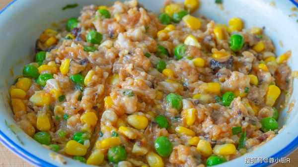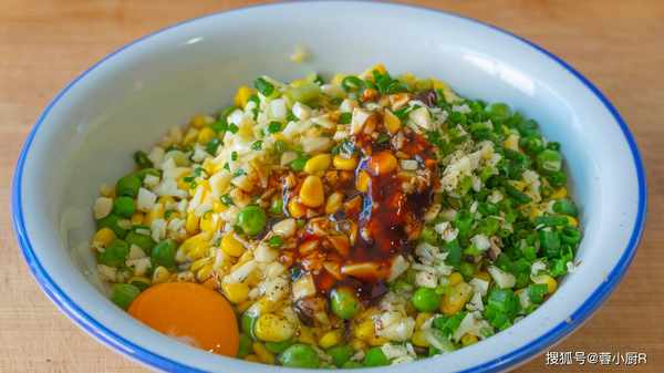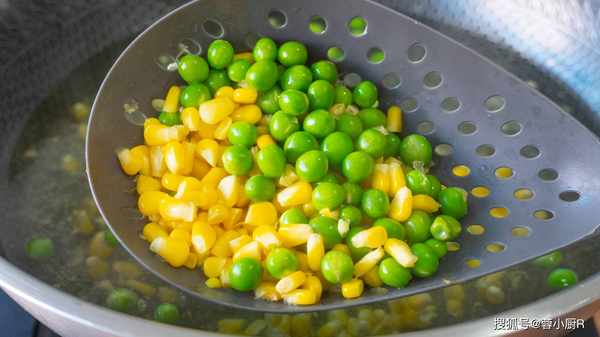6、起鍋燒水,水開加兩油,然後倒入青豆和玉米,焯水2分鐘後撈出來,瀝幹水分備用,然後先放一旁。