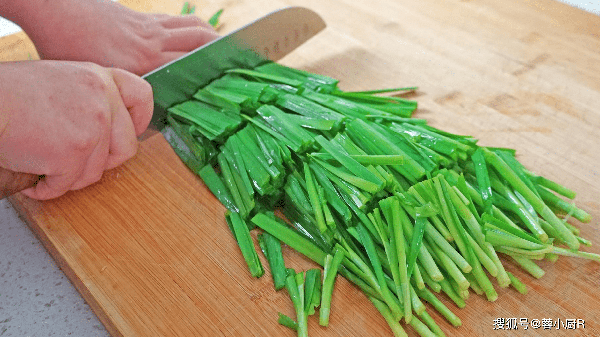 3、接著放入流動的清水中多清洗幾遍,韭菜洗好後切成小段兒,切好後葉子和梗子分開裝。