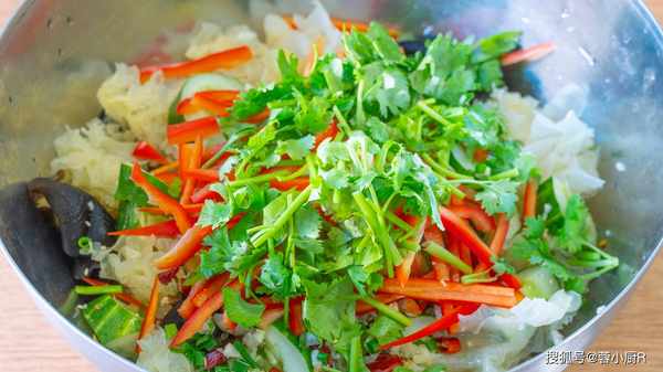10、擠幹水分後裝入大碗裡,加黃瓜、蔥花、蒜末、幹辣椒、白芝麻、熱油,熱油可以瞬間激發出香味兒,再加生抽、香醋、雞精、鹽、白糖、紅彩椒、香菜。