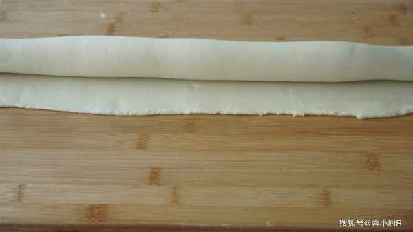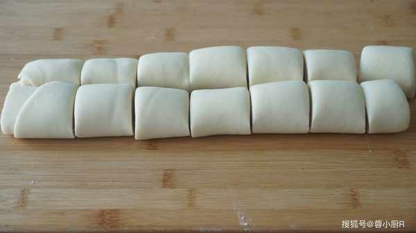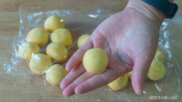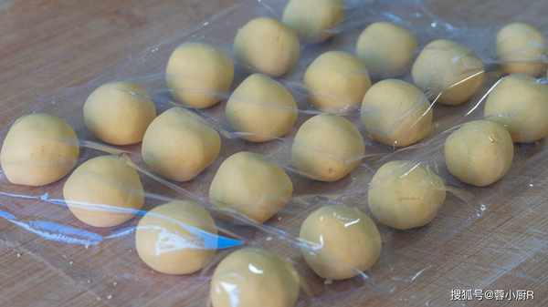 16、取出來移到砧板上,揉一揉後搓長條,再分成小面劑子,分好後先把它們搓圓,然後用保鮮膜包起來,避免風幹。