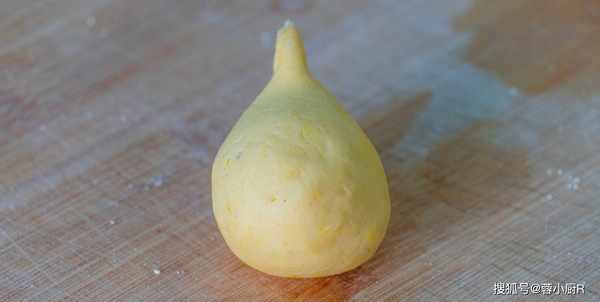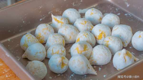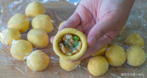 17、做的時候取出一個,用手指壓一下,再用轉圈的方法轉出一個小窩窩,中間放上一勺餡料。