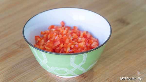 4、紅彩椒1個,洗凈去籽後也切成小丁;再來一把小蔥,切成蔥花。