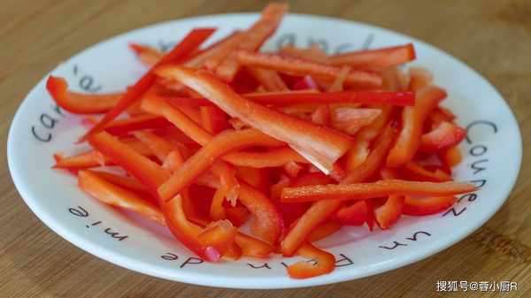 4、再來一個紅辣椒,清洗幹凈後去籽切絲,切好後也先裝起來。