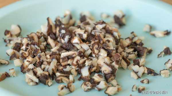 7、香菇這時候也泡好瞭,先擠幹水分,然後切成小丁。