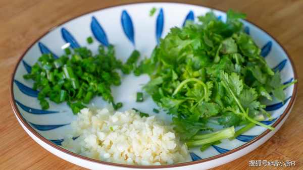 5、接著來切點小蔥、香菜、和大蒜,小蔥切蔥花,香菜切段兒,大蒜剁成蒜末。