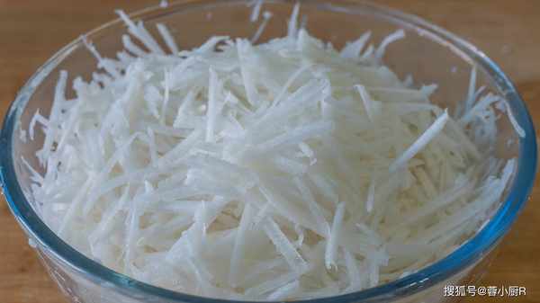 1、白蘿卜兩個,洗凈後先削皮,然後擦成細絲,裝入大碗裡後加一勺鹽,抓板均勻醃制20分鐘,醃出蘿卜裡面的水分,同時還能去一下白蘿卜的辣味。