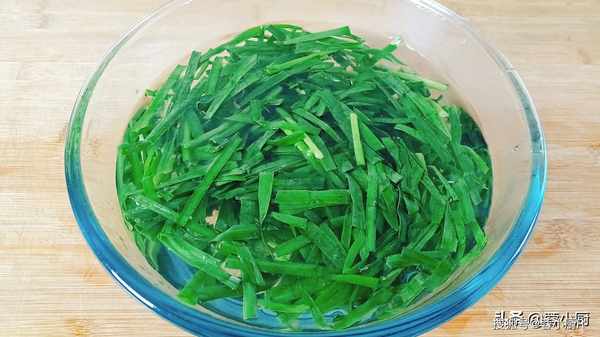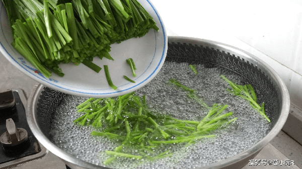 4、起鍋燒水,水開加一勺鹽和兩滴食用油,然後先下韭菜梗子焯水,梗子比較硬,1分鐘後再倒入韭菜葉子,焯水10秒就可以關火撈出來瞭。