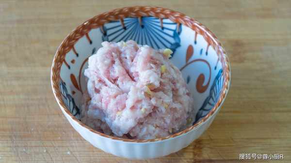 2、接著準備150克豬肉,洗凈後切小塊兒,倒入絞肉機裡面,加點生薑一起打成肉沫,打好後先倒出來備用。
