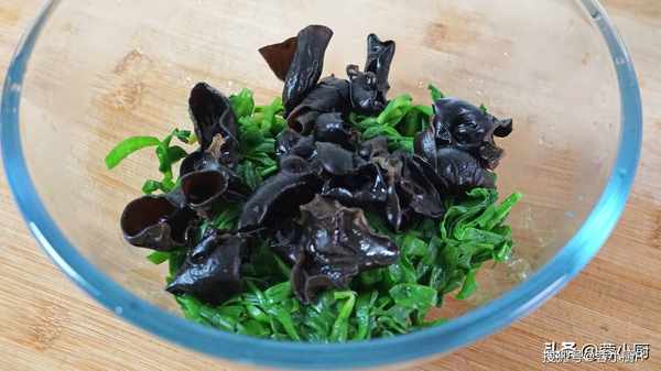 6、過完涼水後把韭菜擠幹水分,然後和木耳木耳裝一起備用。