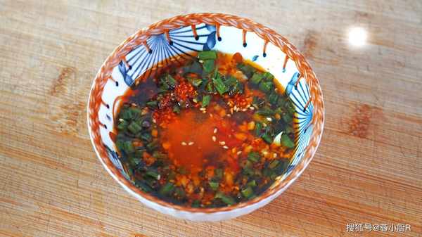 8、準備一個小碗,倒入蔥花、小米椒、蒜末,白芝麻,辣椒粉,再淋上一大勺熱油,香味兒瞬間就激發出來瞭。