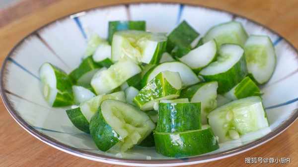 3、接著準備一根黃瓜,清洗幹凈後去頭去尾,然後用刀拍碎,再切成小塊兒,裝起來先放一旁。