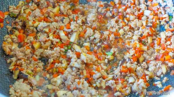 5、起鍋熱油,倒入肉沫,先把肉沫炒散,顏色發白後加蔥薑爆香,再來一勺料酒去腥。然後把香菇和紅椒一起倒進來,翻炒均勻後簡單調個味兒,生抽、蠔油、鹽, 胡椒粉,拌勻後就可以關火瞭,盛出來後先放一旁。